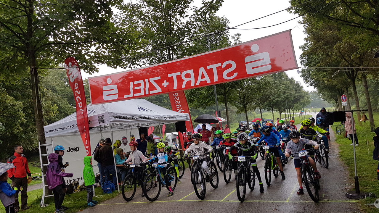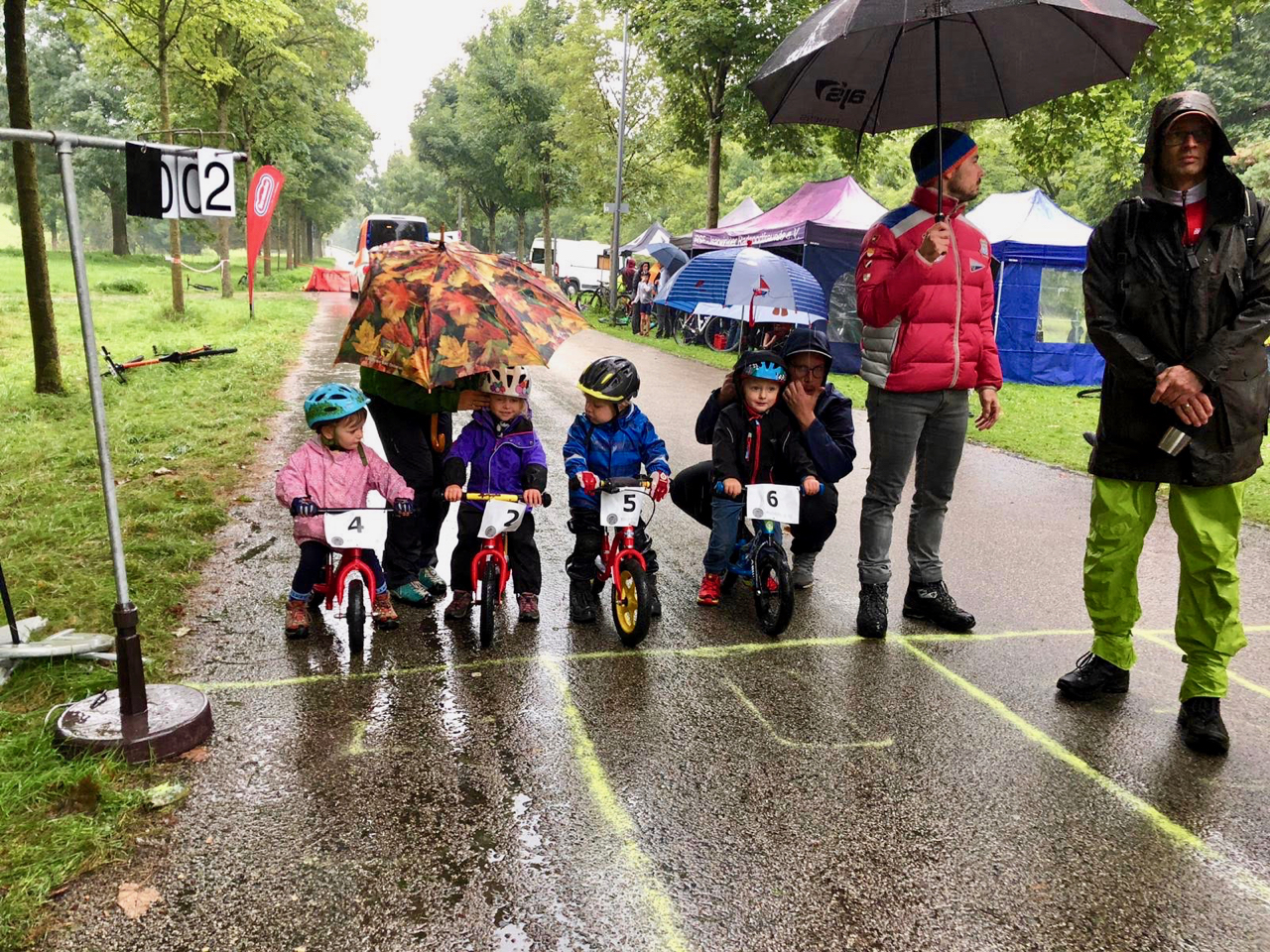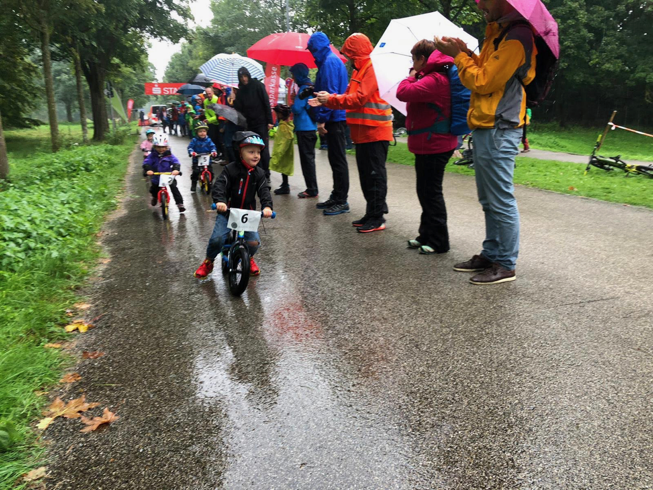 Das nasse Wetter hielt jedoch die gemeldeten Kinder und Jugendliche nicht davon ab, ihre Startnummern abzuholen und an den Start zu rollen – insgesamt hatten wir 120 Kinder und Jugendliche in den verschiedenen Altersklassen. Es gab sogar noch einige Kurzentschlossene, die am Tag selbst noch nachmeldeten. Im Anschluss durften auch noch die Erwachsenen ihr Können unter Beweis stellen. Wir vom MTB-Club Münchens fuhren wie schon im Vorjahr um die Vereinsmeisterschaft. Spätestens jetzt war die komplette Strecke unter Wasser, Schlauchboot und Schwimmflügel wären die bessere Ausstattung gewesen. Die Erwachsenen zeigten auch eine nicht ganz so gute Startermoral 😉 so war das Feld überschaubar, aber die anwesenden schienen viel Spaß zu haben. Ganz tapfer haben sich die ganz kleinen im Laufradrennen geschlagen, hier hat es doch schon mega geregnet.